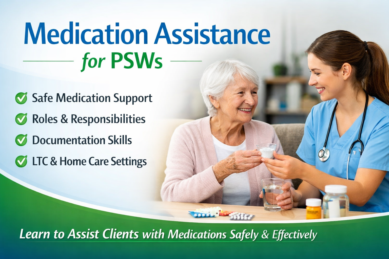 This course provides Personal Support Workers (PSWs) with the essential knowledge and skills to safely assist clients with medications in long-term care, home care, and community settings. Learners will understand their role, legal scope of practice, medication safety principles, and proper documentation, while recognizing the difference between medication assistance and administration.
